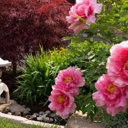 Flowering pionie tree, dwarf maple tree and garden lantern